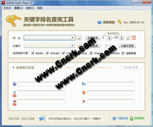 查询关键字在Baidu、google、yahoo、soso、bing、搜狗和有道七大搜索引擎中的排名。工具具有自定义保存网址和关键字、批量查询、查询结果导出、关键字密度查询等功能,提高您在seo关键字排名方面工作的效率。
