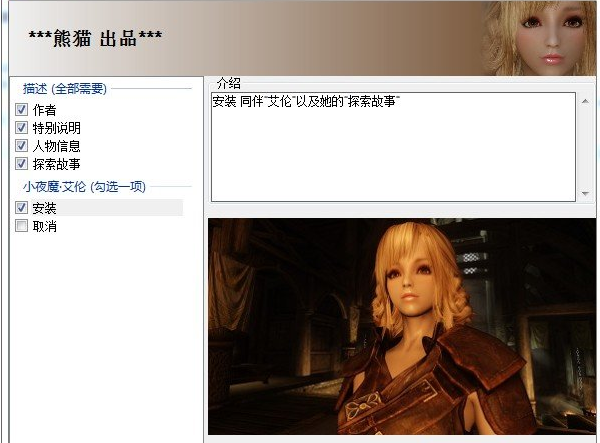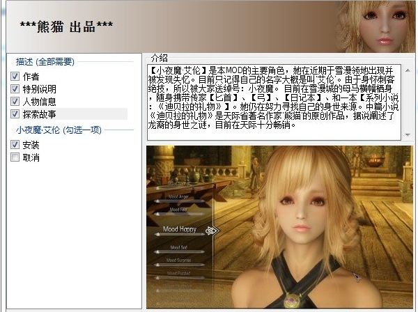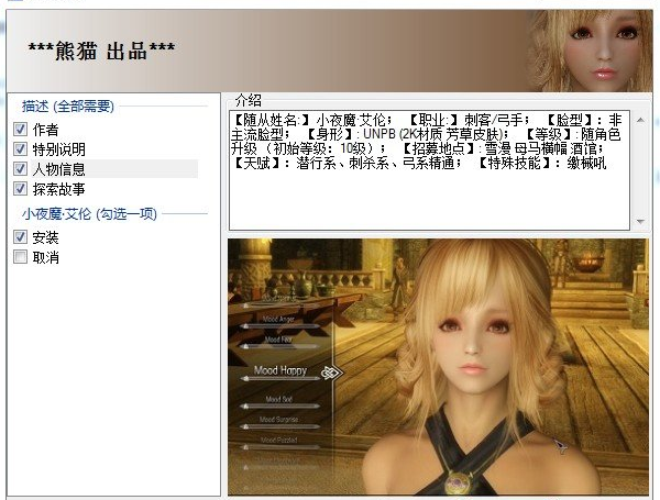 此MOD是熊猫历经数月的综合型作品,包括:随从MOD:一名熊猫自己使用时间最长,做工最细的主角(现已制成随从【小夜魔·艾伦】);