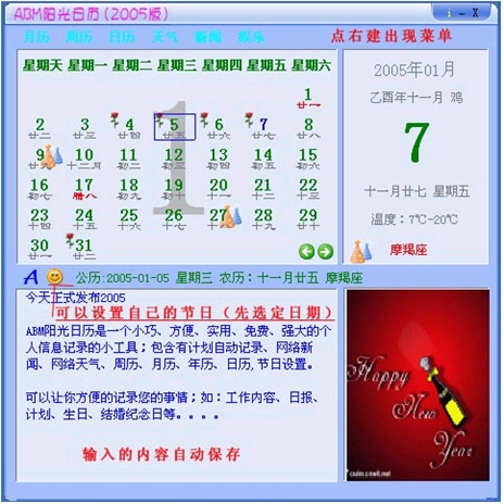 阳光日历 V11.1 绿色免费版 阳光日历是一个小巧、方便、实用、免费、强大的个人信息记录的小工具;包含有计划自动记录、网络新闻、网络天气、周历、月历、年历、日历,可以方便进行数据汇总导出到Txt,Word文件中。可以让你方便的记录您的事情;如:工作内容、日报、周报、月报、工作计划、日记、工作总结、记录你的重要节日,比如生日、父母的生日、结婚纪念日等等