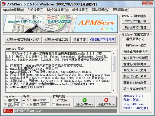 APMServ5.2.6是一款拥有图形界面的快速搭建Apache2.2.9、PHP5.2.6、MySQL5.1.28&4.0.26、Nginx0.7.19、Memcached1.2.4、phpMyAdmin2.11.9.2、OpenSSL、SQLite、ZendOptimizer,以及ASP、CGI、Perl网站服务器平台的绿色软件。无需安装,具有灵活的移动性,将其拷贝到其它目录、分区或别的电脑时,均只需点击APMServ.exe中的启动按钮,即可自动进行相关设置,将Apache和MySQL安装为系统服务并启动。APMServ集合了Apache稳定安全的优点,并拥有跟IIS一样便捷的图形管理界面,同时支持MySQL5.0&4.0两个版本,虚拟主机、虚拟目录、端口更改、SMTP、上传大小限制、自动全局变量、SSL证书制作、缓存性能优化等设置,只需鼠标一点即可完成。软件内还集成了