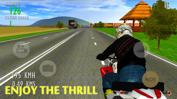 《高速公路摩托 HIGHWAY ATTACK: MOTO EDITION》是一款竞速游戏。游戏模式比较简单,进入游戏后,摩托会自动驾驶,利用重力感应控制方向。点击加速按钮后,摩托会获得加速。点击另外一个按钮后,会在前方一定距离出现跳板,适当的利用这一点,可以避免很多障碍。