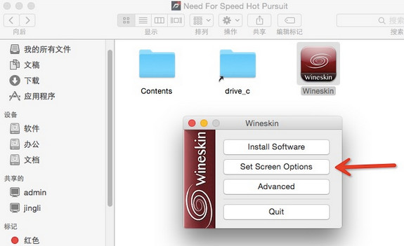 某位网友提供游戏全屏的方法,打开Finder ,-应用程序–Need For Speed Hot Pursuit右键显示包内容-Wineskin 打开这个软件、