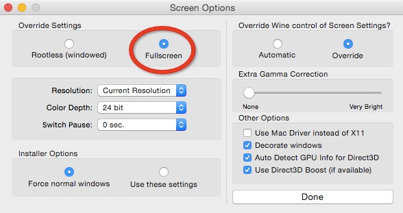 选择 full screen 全屏。done 并且退出,打开游戏即可。