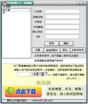 IP轻松换是一款免费的个人软件,主要解决大家在不同的网络需要更换IP地址的问题,你可以随意使用与传播。 更新说明 已修正部分错误,美化界面