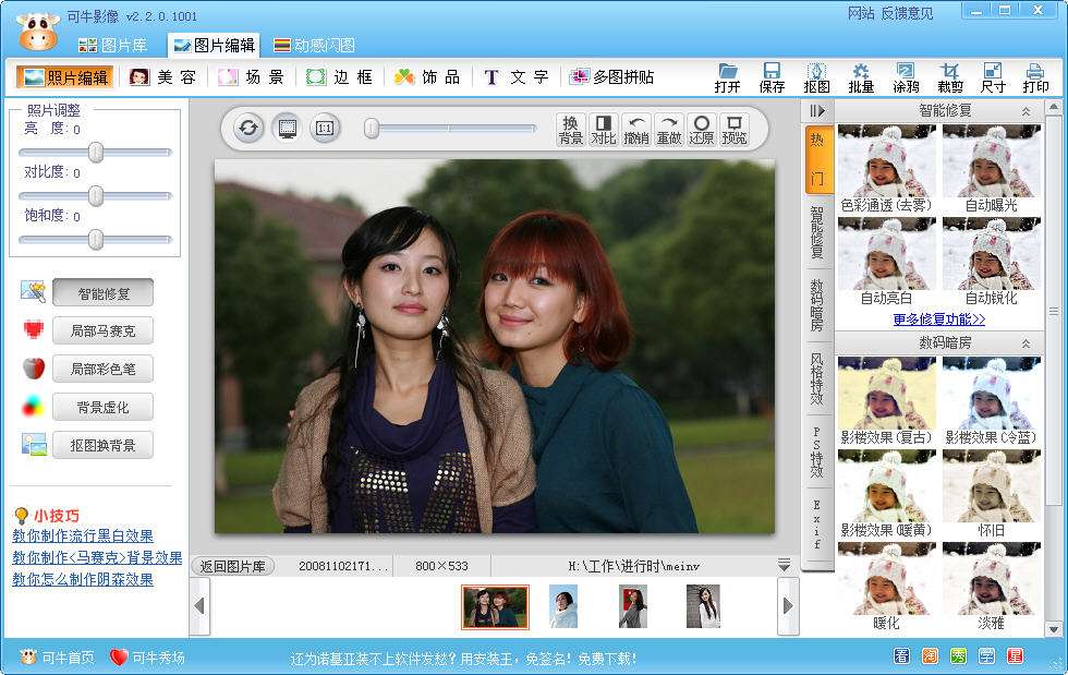 可牛影像 是一款强大的免费照片处理管理软件。可牛影像内嵌上千张日历、宝宝照、大头贴、婚纱照、非主流场景,无须任何PS技巧识即可轻松制作支持多图场景,一张日历、婚纱、宝宝照中可内嵌多张照片,制作效果很酷。软件集成了超强人像美容及影楼特效智能人像柔焦美容,1秒钟呈现朦胧艺术感觉,像冷蓝、冷绿、暖黄、复古四大影楼特效,让你冷艳、唯美、风情……