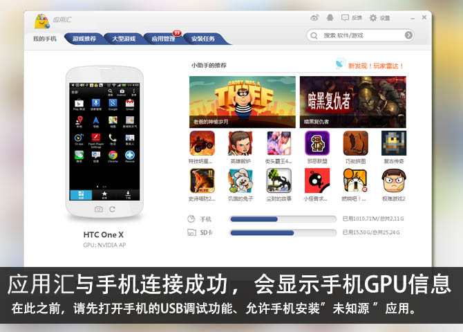 助手与手机连接成功,在成功安装应用汇精灵后,会显示出手机相关信息,当然,在此之前,需要先打开手机的USB调试功能、并允许手机安装“未知源”应用,关闭手机的USB存储功能。