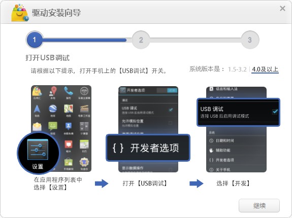 ? 当应用汇检测到还没有驱动的手机后,会弹出“打开USB调试”的对话框。