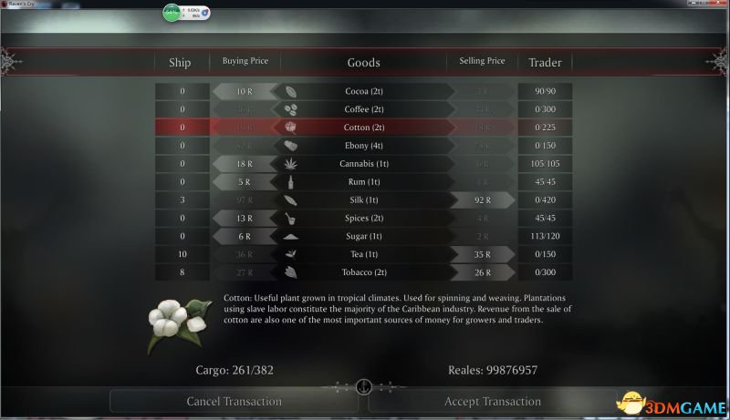 每个港口都有一个“商人”(Merchant),找到他们后进入贸易界面;非常简单,左边是你船上拥有的货物和在当前港口的买入价格;