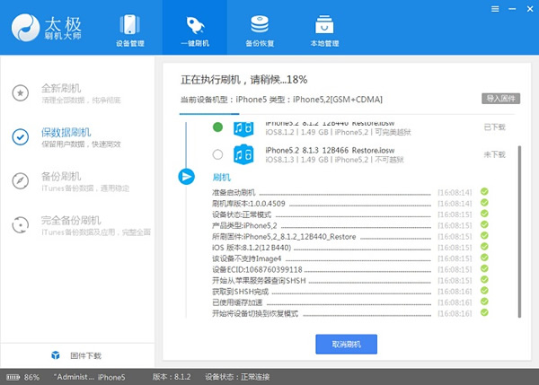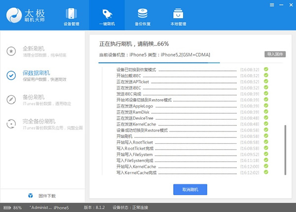 太极刷机大师是一款集手机恢复、数据备份、数据找回等多种功能于一体的软件,适合经常刷机越狱、数据丢失的同学。 使用太极刷机大师可以一键刷机,一键备份数据,方便快捷。太极刷机大师提供了四种刷机模式,普通刷机模式、保留数据刷机模式、iTunes备份刷机和iTunes完全备份刷机模式,四种模式各有特点,用户可根据自己的需求来进行不同形式的刷机,让刷机只需一键!【软件特点】