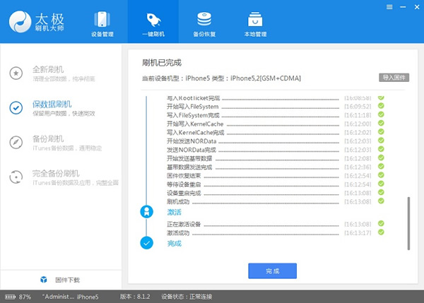 6、 等待几分钟后,刷机完成!太极刷机大师会自动帮您激活设备。如果刷机失败,请按照对应的提示进行操作,还可进入太极刷机大师官方QQ群(425811150)进行咨询。