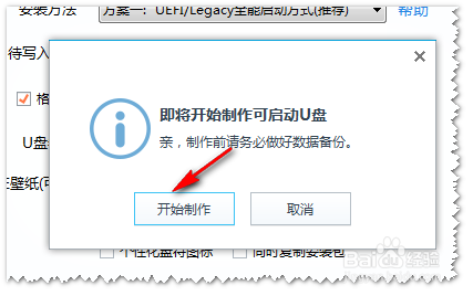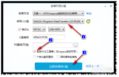 在弹出的第二个页面中,确认当前U盘,勾选”包含DOS工具箱“,之后点击”立即安装进U盘“,在弹出的提示上点击”开始制作“。