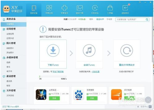 6、显示需要安装iTunes才可以管理您的苹果设备,所以点击下面的下载安装iTunes即可。