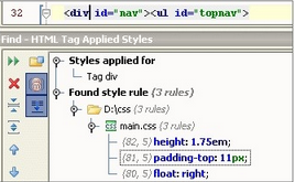 快速查看样式:在HTML标签上进行右键,选择ShowAppliedStylesForTag。可以快速查看该标签应用的样式。类似于前端开发工程师常用的firebug。