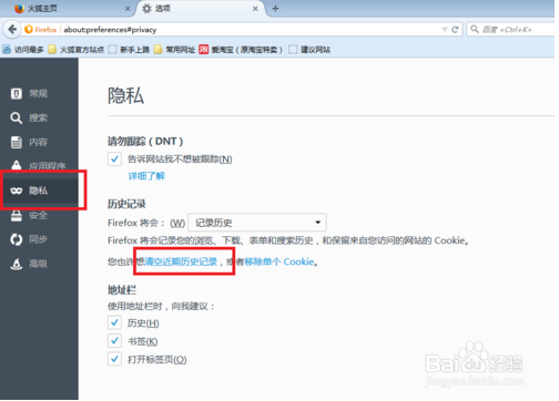 在跳出来的选项页面,点击”隐私选项“,在历史记录一栏里单击”清空近期历史记录“