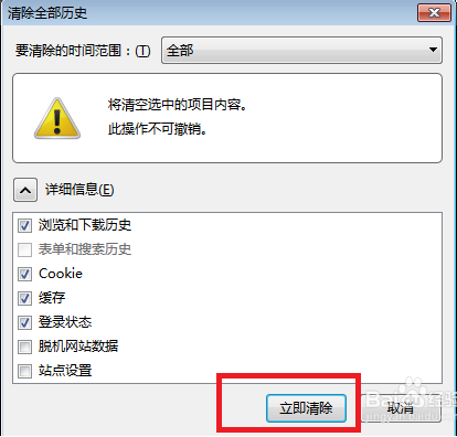 在跳出来的界面框,选择想要清除的缓存时间以及想要清除的缓存内容,点击”立即清除“则大功告成。