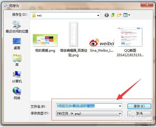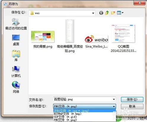 弹出保存框,重新命名图片,选择合适的位置,选择图片保存格式(图片有PNG、jpg、bmp、gif四种格式),点击保存。