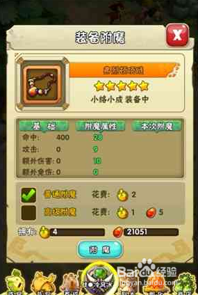 3.附魔:可对所有装备进行附魔,普通附魔消耗材料,而高级附魔除消耗材料外还要花费龙蛋。高级附魔所提升的属性和战力比普通附魔更多一些。