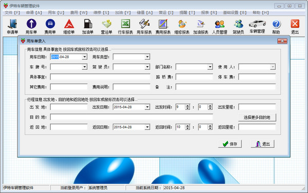 2.用车单记录车辆的外出日期,外出地点,使用部门,使用人员,行程里程数,停车费,过路费,用时分钟等信息,能有效规范车辆的使用情况。
