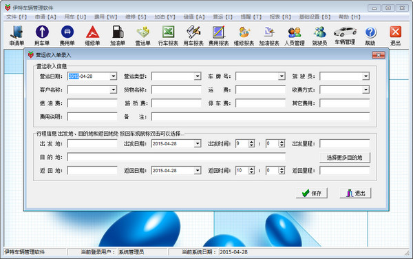 4.营运单”记录车辆的营运收入信息,包括营运类型,车牌号,驾驶员,客户名称,货物名称,运费,收款方式,燃油费,出发地,目的地,返回地等各种信息。