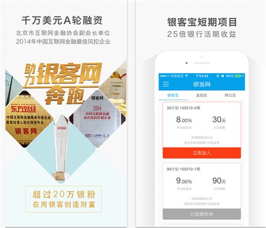 银客网凭借自身的技术和P2P产品优势,为广大投资者提供高收益、低风险的互联网理财产品,年化收益7%~15%以上。银客网通过互联网技术降低融资成本,使投资人获得稳健的收益。让您足不出户轻松跑赢CPI,成为掌握财富密码的银行家。