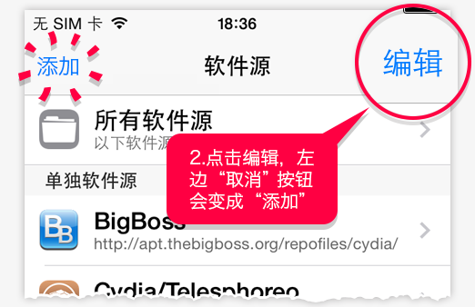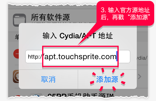 【3】点击编辑后,左边按钮会变为 "添加",点 "添加",在弹出窗口输入官方源地址:apt.touchsprite.com