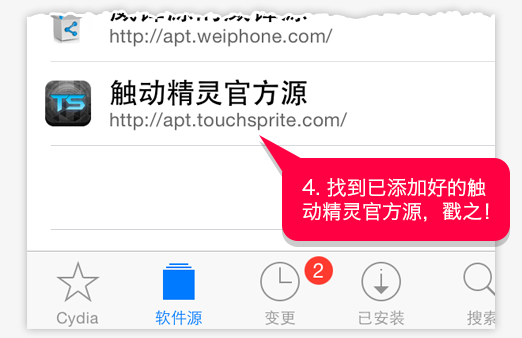【4】在Cydia首页 "软件源" 中,找到已添加好的官方源,猛戳
