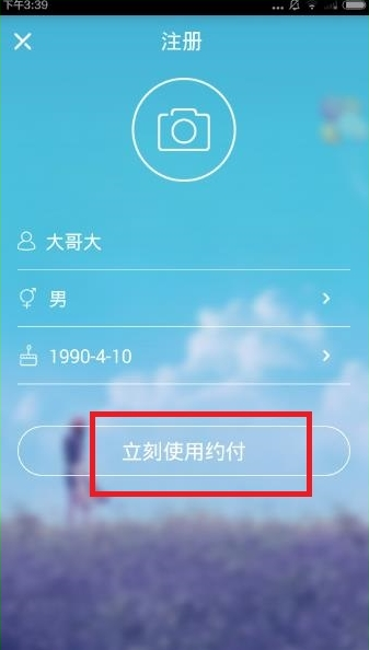 3、在这里,输入名称,性别,选择出生年月日,点击【立即使用约付】即可成功注册登录哦,快来下载试试吧