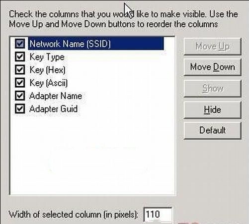 在“View”菜单中选择“ChooseColumns”,在弹出的窗口中定制显示方式,例如仅仅显示无线网络名称和无线密码,如图2所示,只要选择“NetworkName(SSID)”和“Key(Ascii)”这两个选项即可。