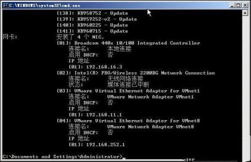 在DOS提示符下执行“systeminfo”即可获取系统中的所有已经启用网卡的信息,被禁用的网卡信息是无法获取的,如图5所示,可以看到系统中有四个网卡,一个是自适应100M网卡“Broadcom440x10/100IntegratedController”、无线网卡“Intel(R)PRO/Wireless2200BGNetworkConnection”以及虚拟机网卡“VMwareVirtualEthernetAdapterforVMnet1”和“VMwareVirtualEthernetAdapterforVMnet8”。