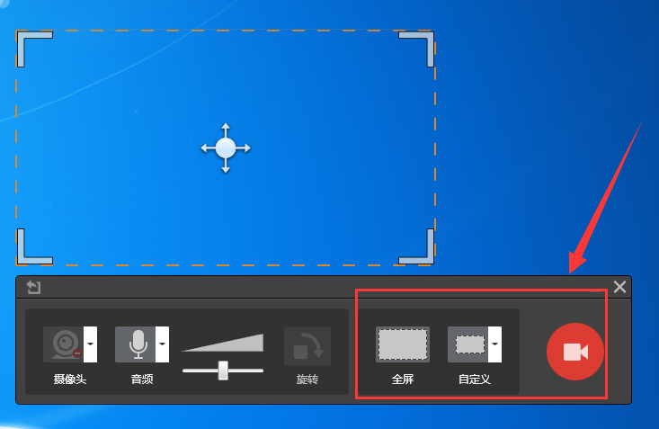 3、接着在弹出的录屏窗口中我们可以直接选择全屏录制,也可以选择自定义来调整录制区域的大小;