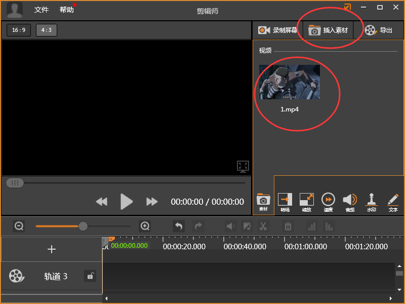 2、登录完毕后在剪辑师界面右上角找到“插入素材”按钮,并将想要调整播放速度的视频添加进来;
