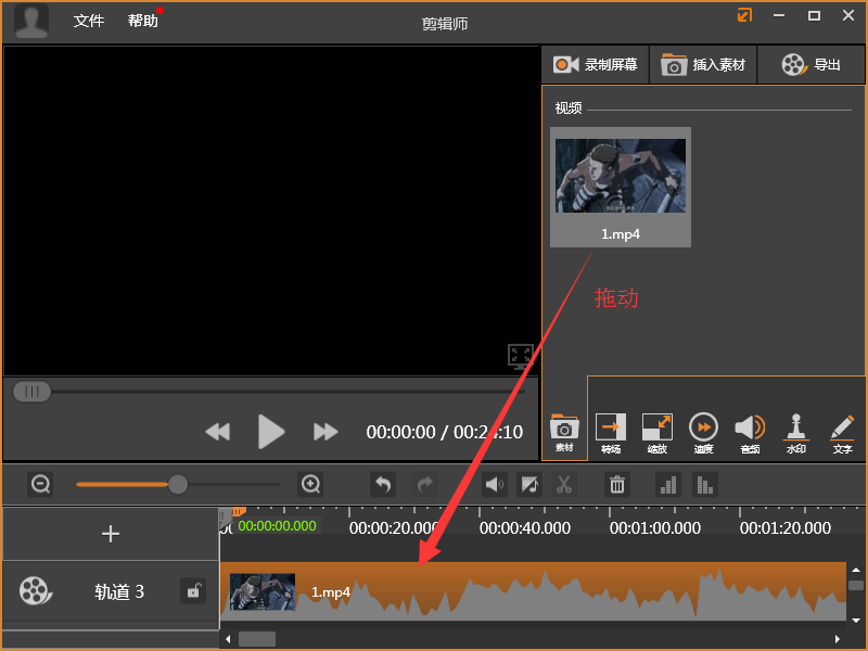 3、添加完毕后拖动该视频到素材区,如下图所示: