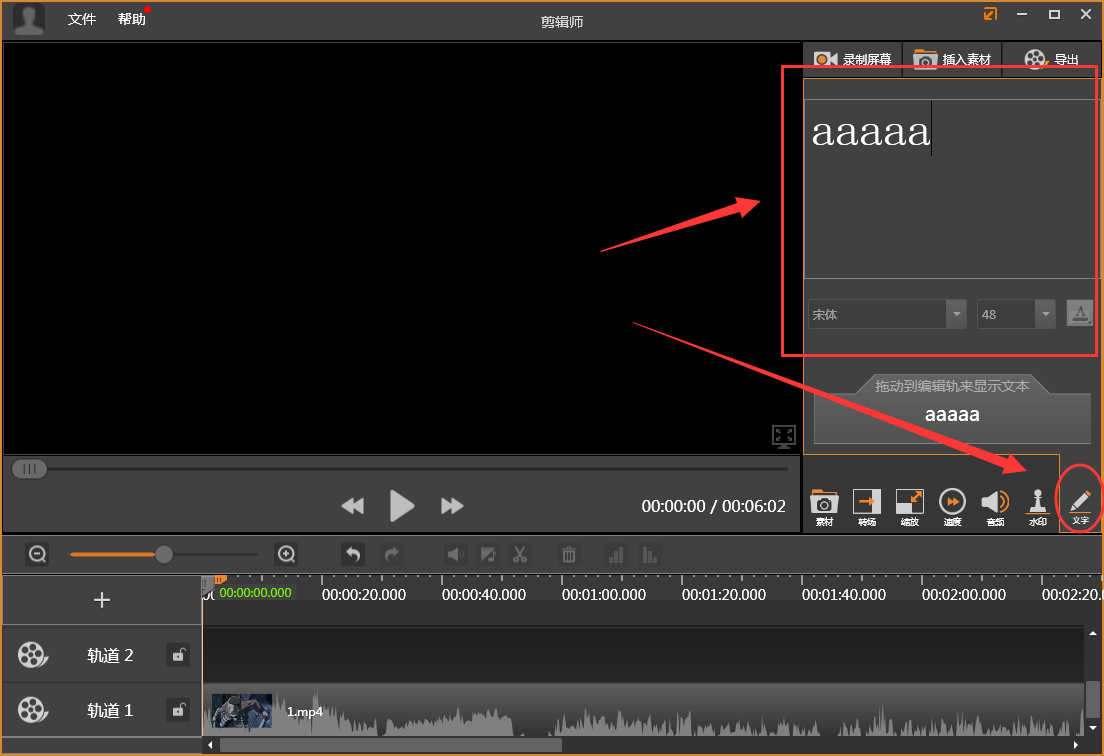 4、接着在剪辑师界面找到“文字”功能并打开,在“文字”界面输入我们想要添加的话,还可以在调整一下文字的字体、大小等属性;