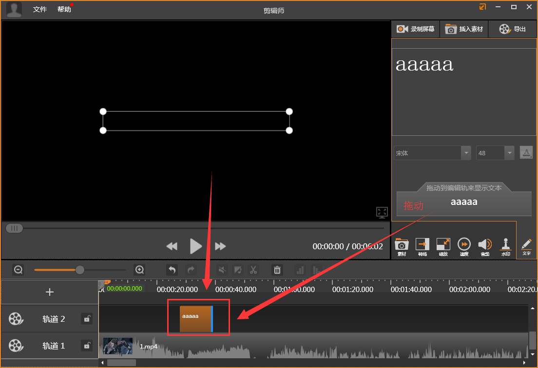5、之后拖动文字也到素材区,通过拖动素材区文字的边框来设置它出现时间的长度,拖动它在视频进度条上的位置即可设置它出现的时间,如下图所示: