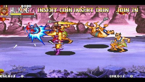 新场景内清理杂兵,这里可以看到一个不断跑出小老鼠的洞,打小老鼠可以获得加分,无聊可以在这里打老鼠玩~不过注意时间别没时间死掉,清理完杂兵往左走进入BOSS战,田鼠王出现,集满气上去接几个必杀钱鼠王会逃跑,在这个场景它还是比较弱的,从左边它逃跑的洞口进入下一场景,赢来最终BOSS战。