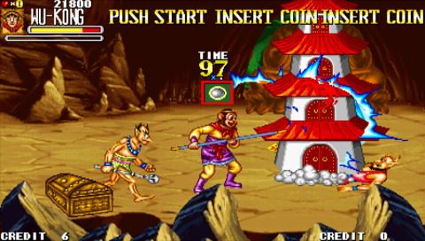 本关小怪也会纵轴移动攻击,比较恶心。一开始进入场景清理几波小怪后,牛魔王出现,这里如果熟悉他的攻击方式可以等他无敌的攻击招数时间过去后,用突击接必杀打。如果不行的话,放宝物吧~优先可放释厄剑,因为后面还有两把。打死牛魔王后,右边进入下一场景。