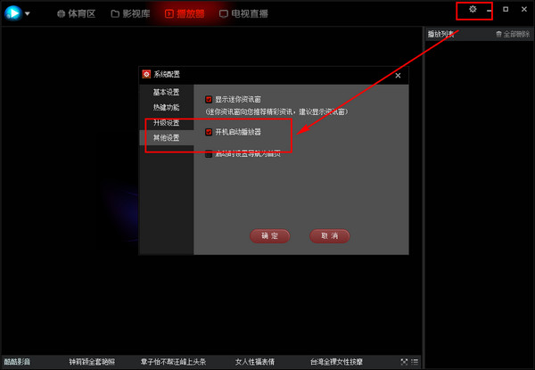 点击右上角设置按钮,在弹出的对话框中选择==其他设置==去掉启动播放器的勾勾