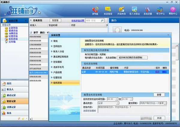 旺铺助手业务具备客户资料管理、来电弹屏、点击拨号、话务管理(包括漏话管理)、短信群发、挂机短信、消费管理、应用数据共享统计等功能的应用服务。