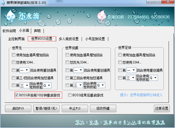 世界BOSS开始前十分钟重启游戏: 如果是在世界开始前很久就开始挂机,建议勾选该选项,可以防止打世界的时候太卡而影响效率。