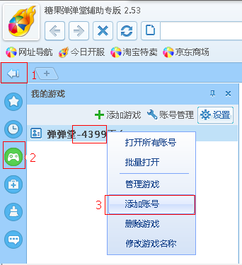 2.使用糖果游戏浏览器保存需要签到的账号。 在浏览器左侧打开我的游戏,右键里面此前保存的游戏名,点击添加账号。