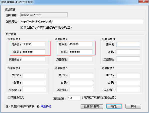 在弹出的添加账号对话框中,输入我们小号的账号密码,完成后点击确定。照此方法保存所有需要签到的账号。