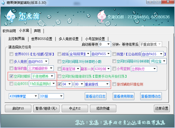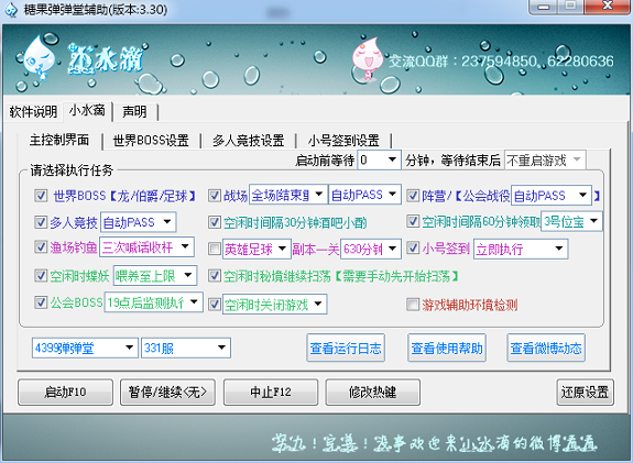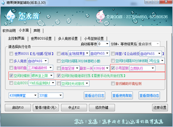 0点后首先手动开始秘境扫荡,然后启动辅助去睡觉~~~一般到早上渔场钓鱼、小号签到、酒吧小酌、大厅宝箱领取、蝶妖喂养、秘境扫荡就都完成了。基本上只需到晚上公会boss结束或者阵营结束后再来玩游戏,中间的世界、战场、阵营、公会boss等等一个都不会落下。