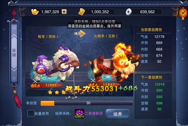 在《狂神无双》中,坐骑并非传统意义上的坐骑,因为它们吃的不是草而是进阶丹药!游戏中,玩家可使用进阶丹可对坐骑进行培养,坐骑每满10星则升级为下一阶;在培养过程中出现暴击可连升2星哦。是不是想试试连升2星的快感,那就来吧~~
