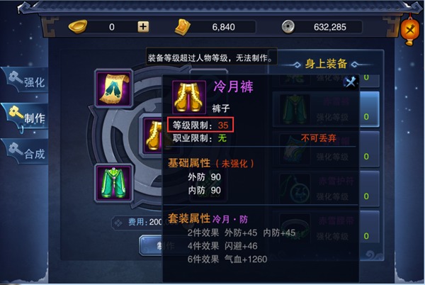 紫装限制等级:10级以上装备,紫色装备等级分为:10级、35级、45级、55级,每级都有一套紫装,在需要制作下一级装备时,需要达到紫色装备穿戴的对应等级,如15级的紫色装备在35级装备时,需要达到35级才能制作。