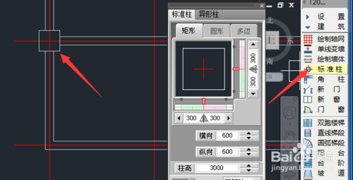 然后在右侧导航栏中选择“标准柱”,然后在图示位置,标准柱中设置完成之后,将鼠标放置柱子位置,点击左键即可将标准柱绘制成功。