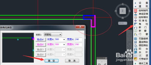 同样点击右侧的“角柱”,然后点击你要绘制的角柱的位置,然后会自动弹出设置对话框,然后设置完成之后,点击“确定”即可。