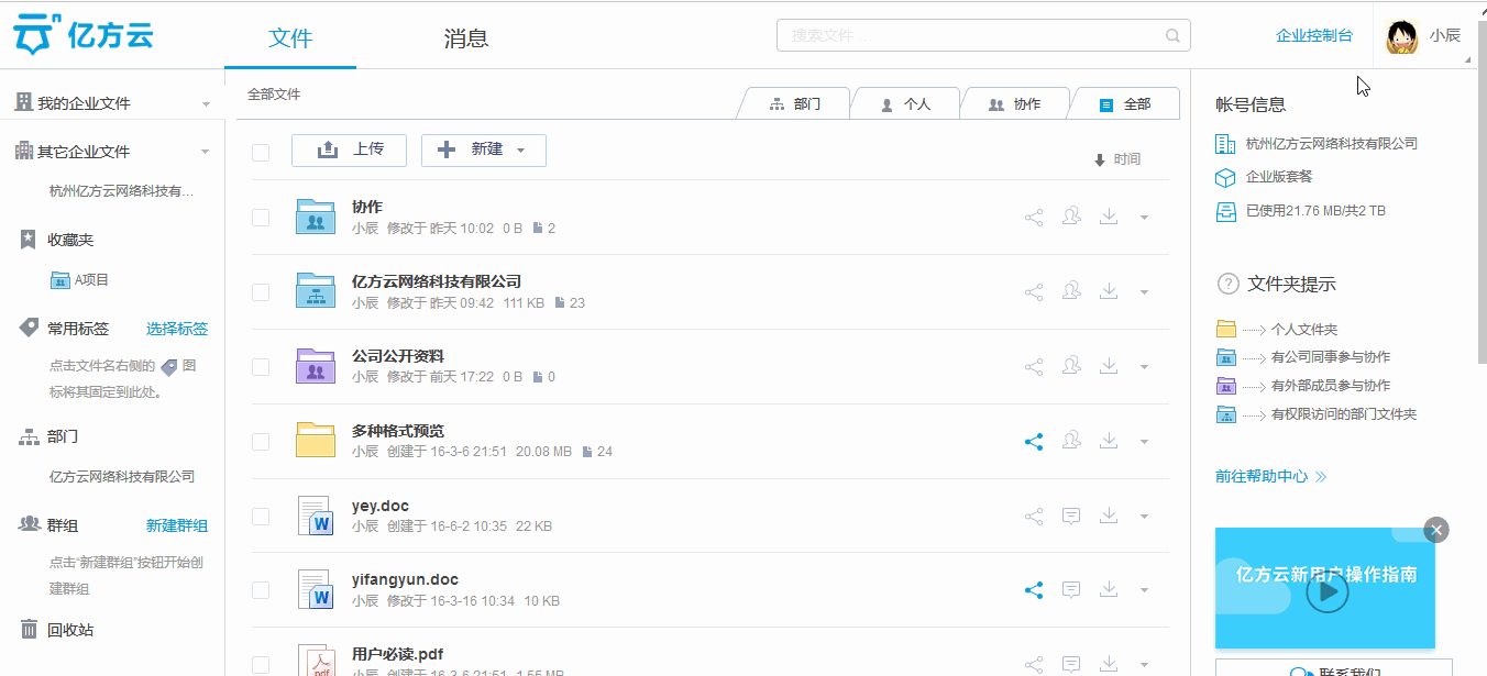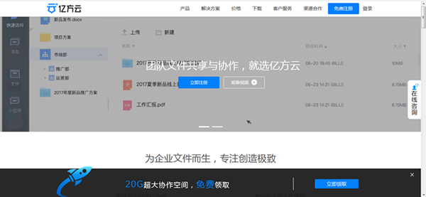 亿方云由杭州亿方云网络科技有限公司独立研发并运营,是为企业提供文件存储与协作服务的云平台,帮助企业实现文件的安全访问与团队的高效协作。与传统网盘相比,亿方云为用户提供了海量的云存储空间,基于存储服务设计的协作、分享、审阅、编辑、评论、预览、消息、搜索等应用功能,把员工与文件紧密地结合在一起。亿方云同步端没有被下过复杂的定义,呈现在用户面前,它只是一个文件夹,一切操作都简单、熟悉;与此同时,它绝不是一个普通的文件夹,你的工作产出、企业资料数据、同事伙伴在不知不觉中都被它无缝连接。
