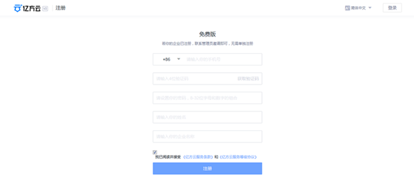 如您的公司还未使用过亿方云平台,您可以在我们官网首页右上角点击”免费注册”即可注册免费版进行使用;也可以点击【价格】选择相应的套餐进行注册操作。