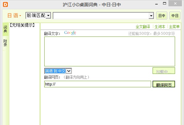 2、在沪江小d日语词典文字框内输入需要翻译的文字,选择翻译语种,输入需要翻译的网页网址。