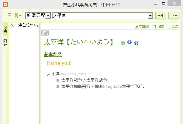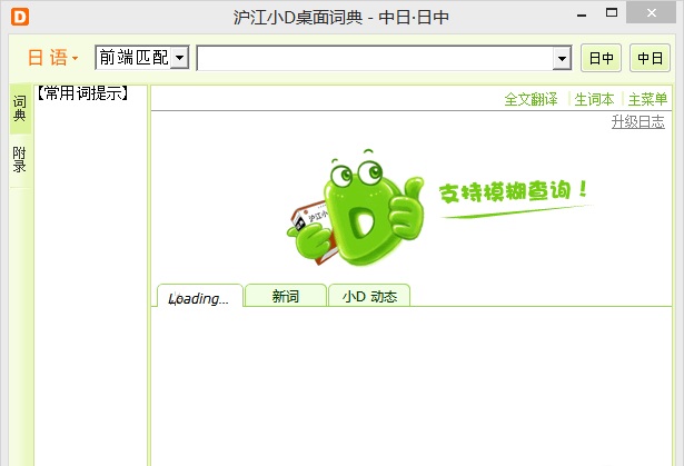 沪江小D日语词典是一款中日日中桌面词典软件,充分考虑中国人的使用习惯,为日语学习者度身定制。该词典拥有海量的日语词库,并支持屏幕取词、真人发音以及TTS朗读等功能。此外,它还集成了网络词库和网络生词本,并提供了专业的日文翻译、强大的模糊查询、及优秀的日语在线翻译等服务。沪江小D日语词典涵盖所有日汉翻译功能,囊括日语单词的发音,解释,参考例句等内容,是极具人气的在线词典,欢迎下载使用!